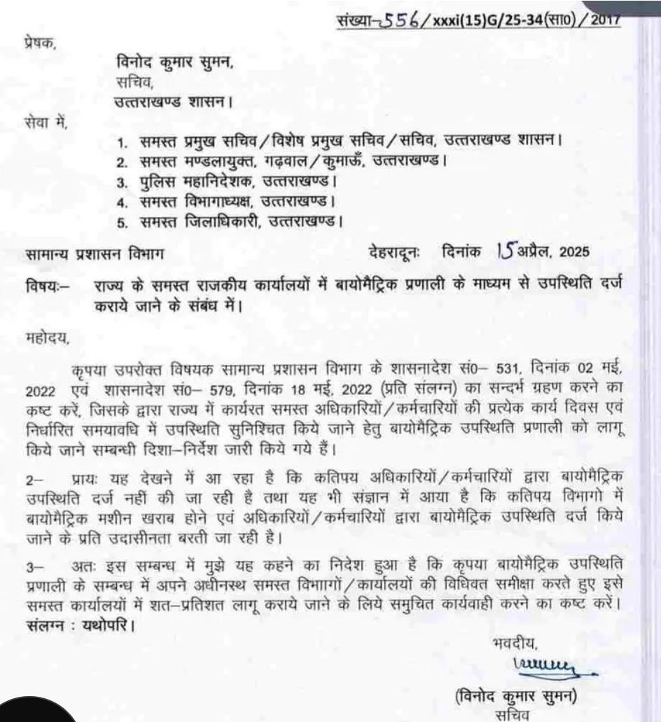 देहरादून। मुख्य सचिव आनंद वर्धन ने एक मई से विभागों में अधिकारियों और कर्मचारियों की बायोमेट्रिक हाजिरी लगाने के निर्देश दिए। उत्तराखंड शासन के द्वारा राज्य के सभी राजकीय कर्मचारियों को लेकर प्रतिदिन बायोमेट्रिक प्रणाली से उपस्थिति दर्ज करने को लेकर आदेश जारी हुआ है। आदेश में बायोमेट्रिक उपस्थिति प्रणाली को लागू किए जाने के संबंध में दिशा निर्देश जारी किए गए, जिसमें यह भी कहा गया है कि प्रदेश में यह देखने को मिल रहा है की कुछ अधिकारियों, कर्मचारियों द्वारा बायोमेट्रिक उपस्थिति दर्ज नहीं की जा रही है, तथा यह भी संज्ञान में आया है की कुछ विभागों में बायोमेट्रिक मशीन खराब होने एवं अधिकारियों कर्मचारियों द्वारा बायोमेट्रिक उपस्थिति दर्ज किए जाने की प्रति उदासीनता बढ़ती जा रही है। इसलिए बायोमेट्रिक उपस्थिति प्रणाली के संबंध में अपने अधीनस्थ सभी विभाग विधिवत समीक्षा करते समस्त कार्यालय में शत प्रतिशत बायोमेट्रिक उपस्थिति लागू किए जाने की कार्रवाई की जाए।