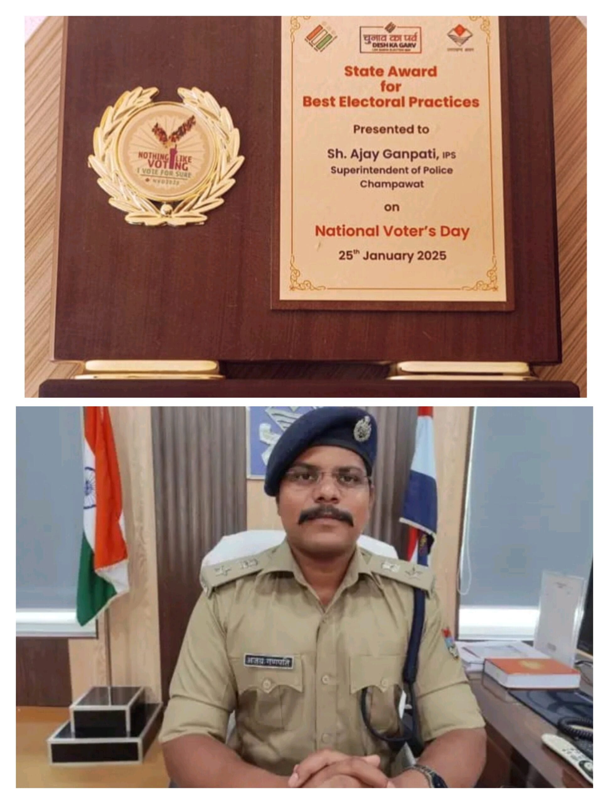 उत्तराखंड के राज्यपाल लेफ्टिनेंट जनरल गुरमीत सिंह द्वारा पुलिस अधीक्षक अजय गणपति के निर्देशन में सकुशल लोकसभा सामान्य निर्वाचन को संपन्न कराए जाने पर पुलिस अधीक्षक महोदय चंपावत की कार्यकुशलता, दक्षता, समर्पण, कर्तव्यनिष्ठा, सूझबूझ, पारदर्शिता तथा अनुकरणीय नेतृत्व क्षमता की सराहना करते हुए State Award for Best Electoral Practices सम्मान से सम्मानित किया गया है।