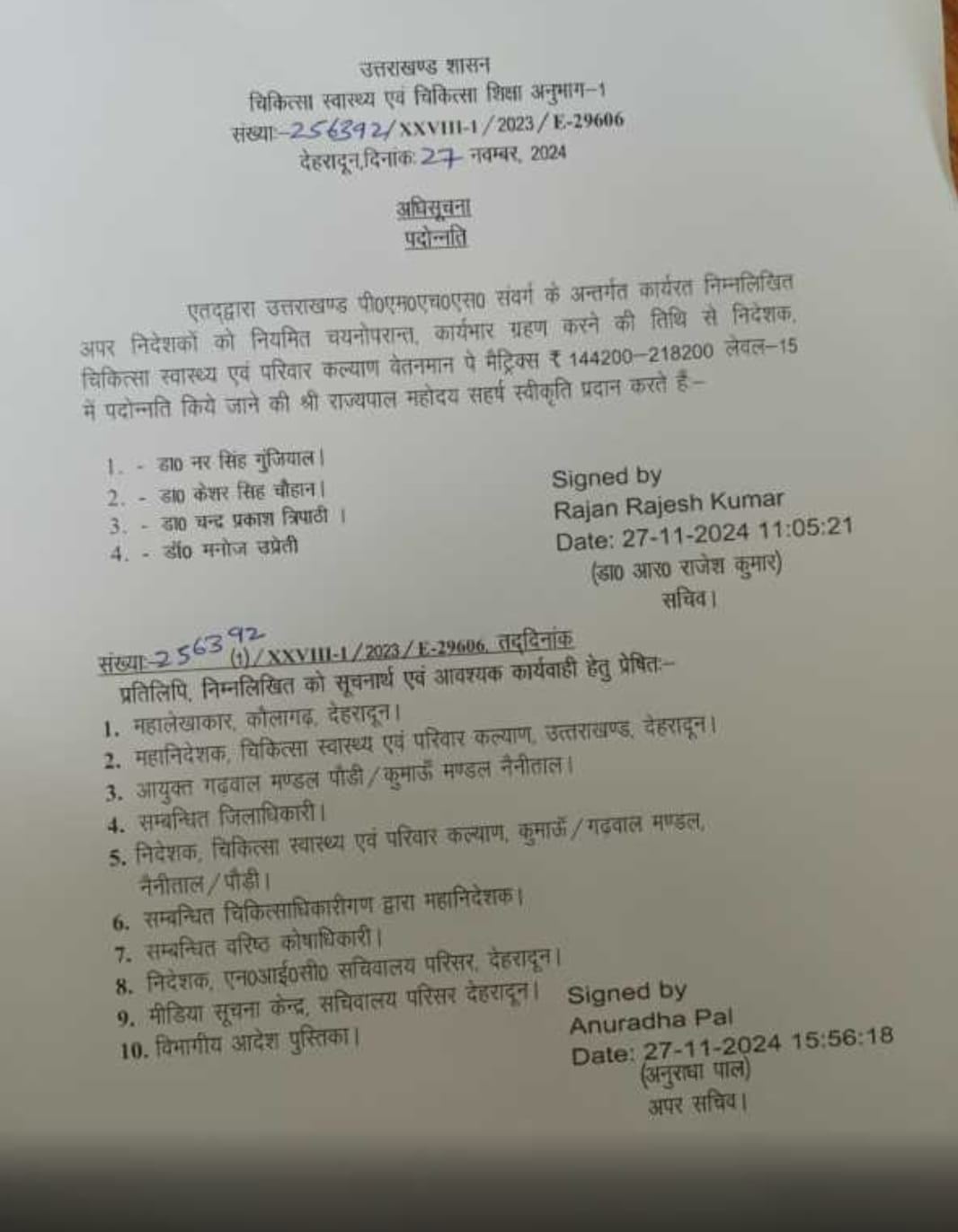 उत्तराखंड स्वास्थ्य विभाग में एक के बाद एक चिकित्सकों की मांगों पर शासन अपनी मुहर लग रहा है। इसके साथ ही प्रमोशन का रास्ता भी साफ होता जा रहा है। उत्तराखण्ड पी०एम०एच०एस० संवर्ग के अन्तर्गत चिकित्सा स्वास्थ्य एवं परिवार कल्याण विभाग में कार्यरत 04 अपर निदेशकों का निदेशक पद पर प्रमोशन हुआ है। प्रमोशन पाने वालों में डा० नर सिंह गुंजियाल, डा० केशर सिह चौहान, डा० चन्द्र प्रकाश त्रिपाठी डॉ० मनोज उप्रेती शामिल हैं। सभी चिकित्सकों को 144200-218200 लेवल-15 का वेतनमान मिलेगा।