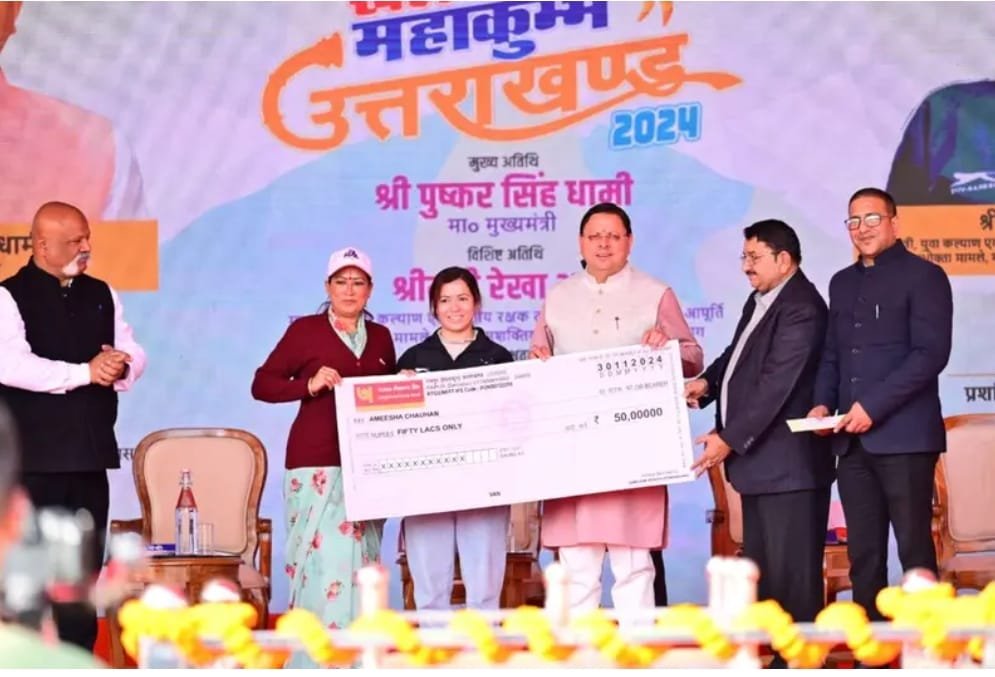 रविवार को युवा कल्याण निदेशालय में खेल महाकुंभ – 2024 की राज्य स्तरीय प्रतियोगिताओं का शुभारंभ करते हुए मुख्यमंत्री पुष्कर सिंह धामी ने उक्त घोषणाएं की हैं। उन्होंने इस अवसर पर डेफ ओलंपिक में स्कीइंग प्रतिभाग करने वाली खिलाड़ी अमीषा चौहान को 50 लाख की प्रोत्साहन राशि का चेक प्रदान किया। एथलेटिक्स में 27वीं नेशनल फेडरेशन में स्वर्ण पदक जीतने वाली सोनिया को 02 लाख और 22वें नेशनल फेडरेशन जूनियर में राहुल सरनालिया को स्वर्ण पदक जीतने पर 01 लाख रुपए का प्रोत्साहन राशि का चेक प्रदान किया।