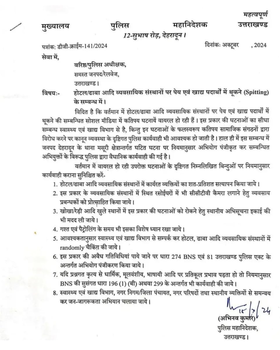 देहरादून– मुख्यमंत्री पुष्कर सिंह धामी के सजग नेतृत्व में राज्य में स्वास्थ्य और कानून व्यवस्था को सुदृढ़ बनाने हेतु निरंतर प्रयास किए जा रहे हैं। हाल ही में सोशल मीडिया पर होटल और ढाबा जैसे व्यवसायिक संस्थानों में खाद्य पदार्थों में थूकने की घटनाओं के वायरल होने के बाद मुख्यमंत्री के संज्ञान में यह मामला आते ही, उनके निर्देशानुसार पुलिस महानिदेशक श्री अभिनव कुमार ने सख्त कार्यवाही करने का आदेश दिया है।